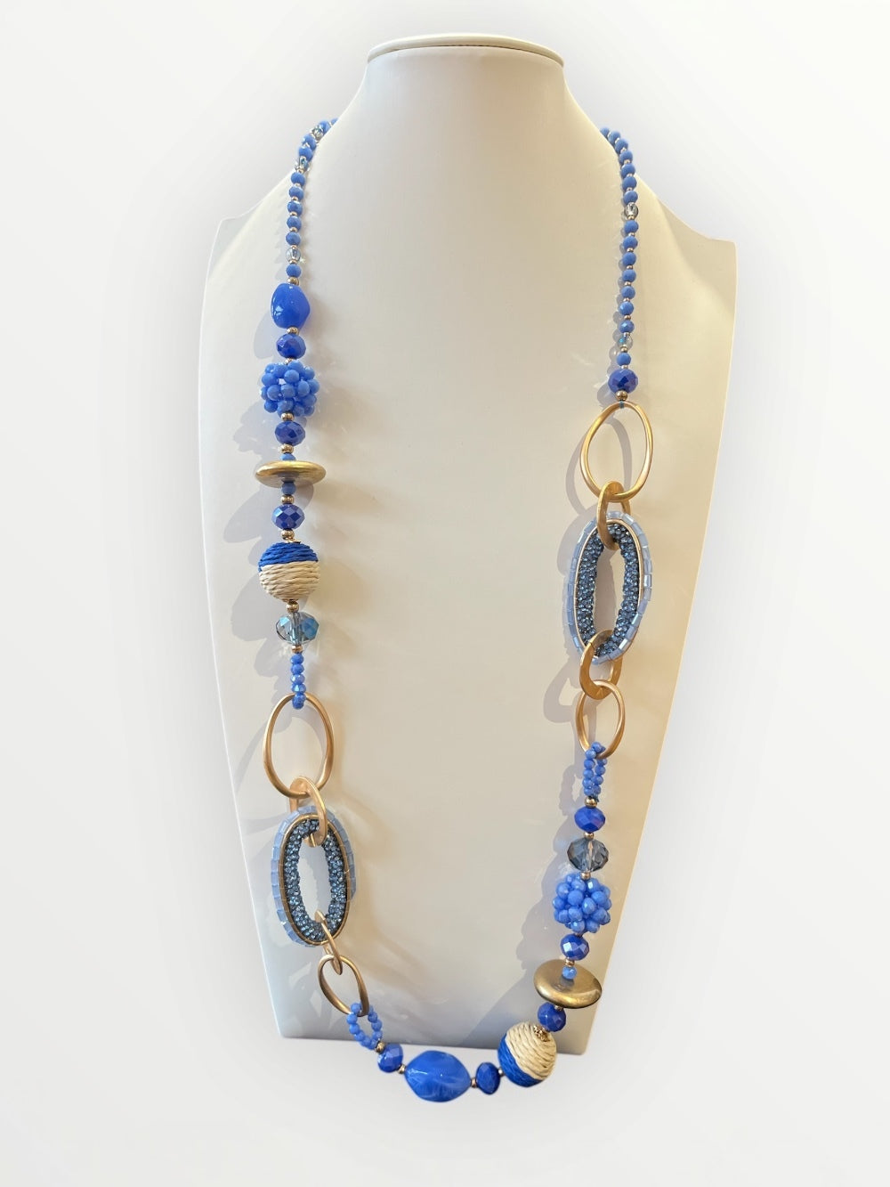 Diese Statement-Kette in leuchtendem Blau ist ein echter Blickfang! Verschiedene Perlenformen, goldfarbene Elemente und geflochtene Details sorgen für einen spannenden Materialmix und machen jedes Outfit sofort besonders. Ob zu schlichten Basics oder als Farbtupfer zu sommerlichen Looks – dieses Accessoire setzt stilvolle Akzente. Ohne Verschluss.