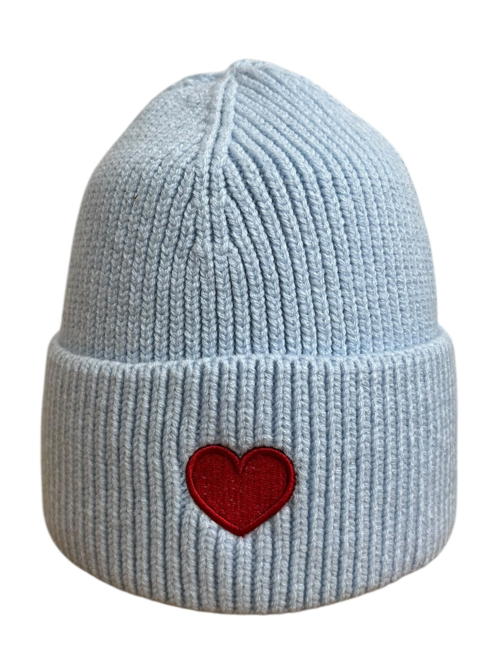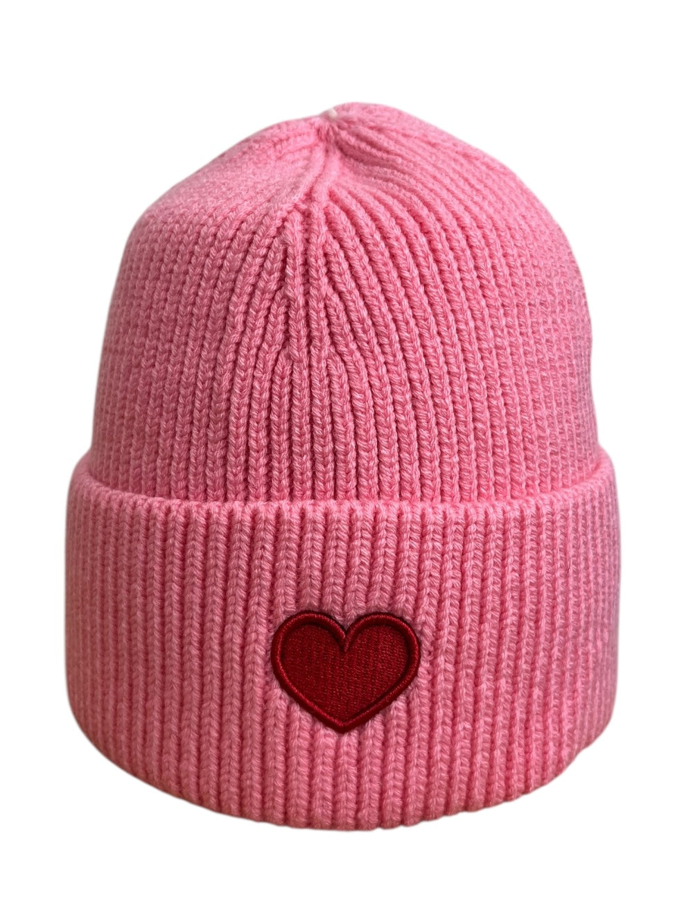 Kuschelweiche Mütze mit breitem Aufschlag und hübscher Herzstickerei in rot. Ganz weiche Viskosequalität. In 2 attraktiven Farben zur Wahl.