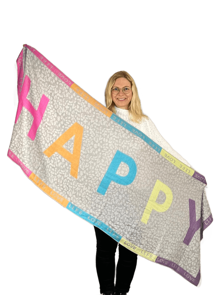 Weicher Schal aus reiner Viskose mit großem Schriftzug HAPPY. Das farbenfrohe Muster sorgt für gute Laune und ist zusammen mit dem Leomuster ein echter Hingucker. Ein vielseitiges Accessoire, das jedes Outfit lebendig macht.