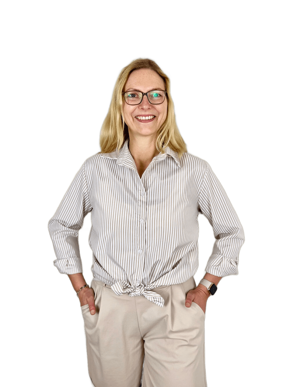Diese beigefarbene Streifenbluse vereint klassische Eleganz mit modernem Chic. Die Rückenpasse und Kellerfalte verleihen eine besondere Note. Lange Ärmel mit Knopfmanschette. Kreiere Deinen persönlichen Look und trage sie vorne geknotet oder ganz klassisch.