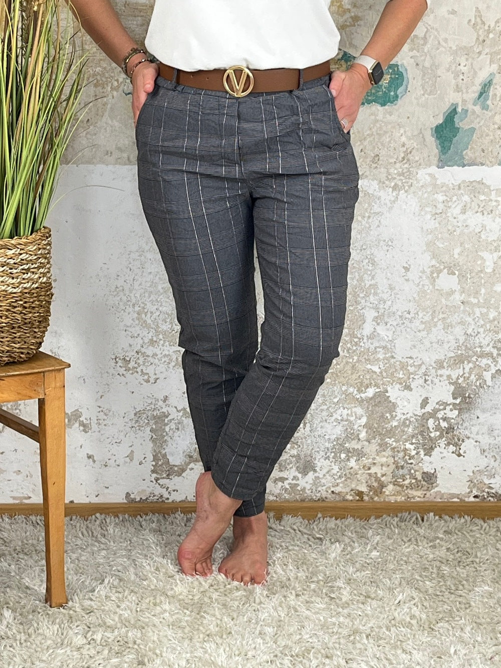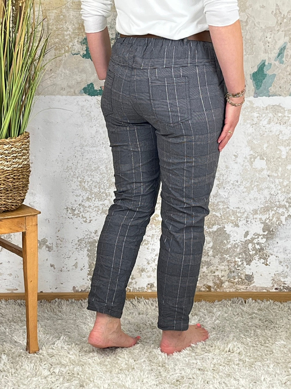 Diese modische Jogpant präsentiert sich im klassischen Karomuster, das durch einen dezenten Glitzerfaden stilvoll aufgewertet wird. Der bequeme Schnitt mit elastischem Bund und Ziergürtel verbindet hohen Tragekomfort mit einem gepflegten Erscheinungsbild. Ein vielseitiges Modell, das sowohl im Alltag als auch in Kombination mit eleganten Oberteilen überzeugt.
