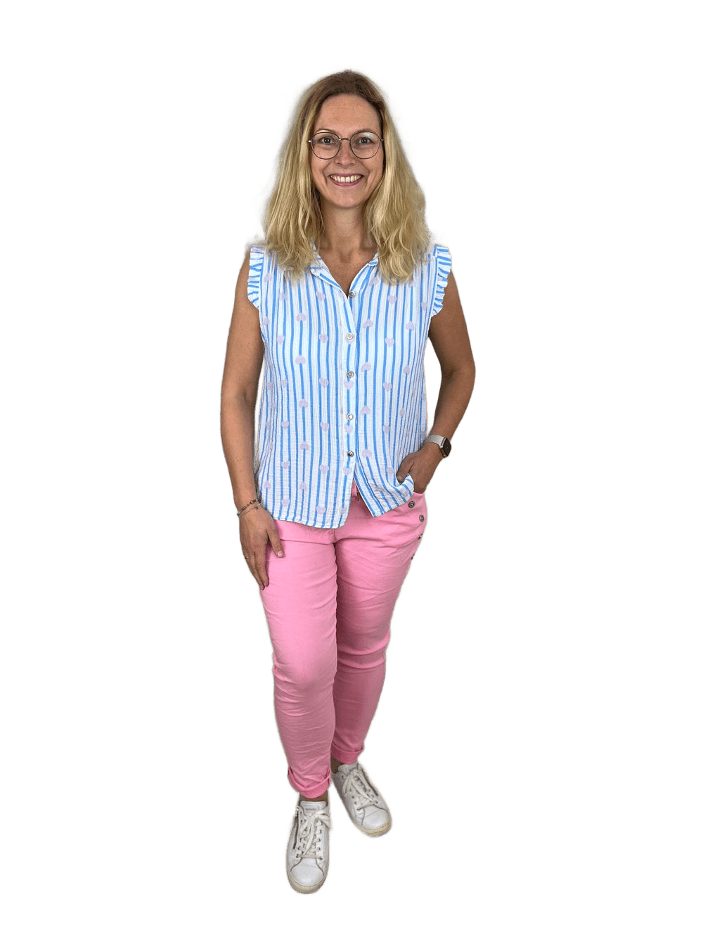 Diese bequeme Schlupf-Hose überzeugt mit ihrem frischen Farbton und modischen Knopfdetails an den Taschen. Der elastische Bund mit Bindeband sorgt für optimalen Tragekomfort – perfekt für lässige Alltags-Looks mit besonderem Touch.