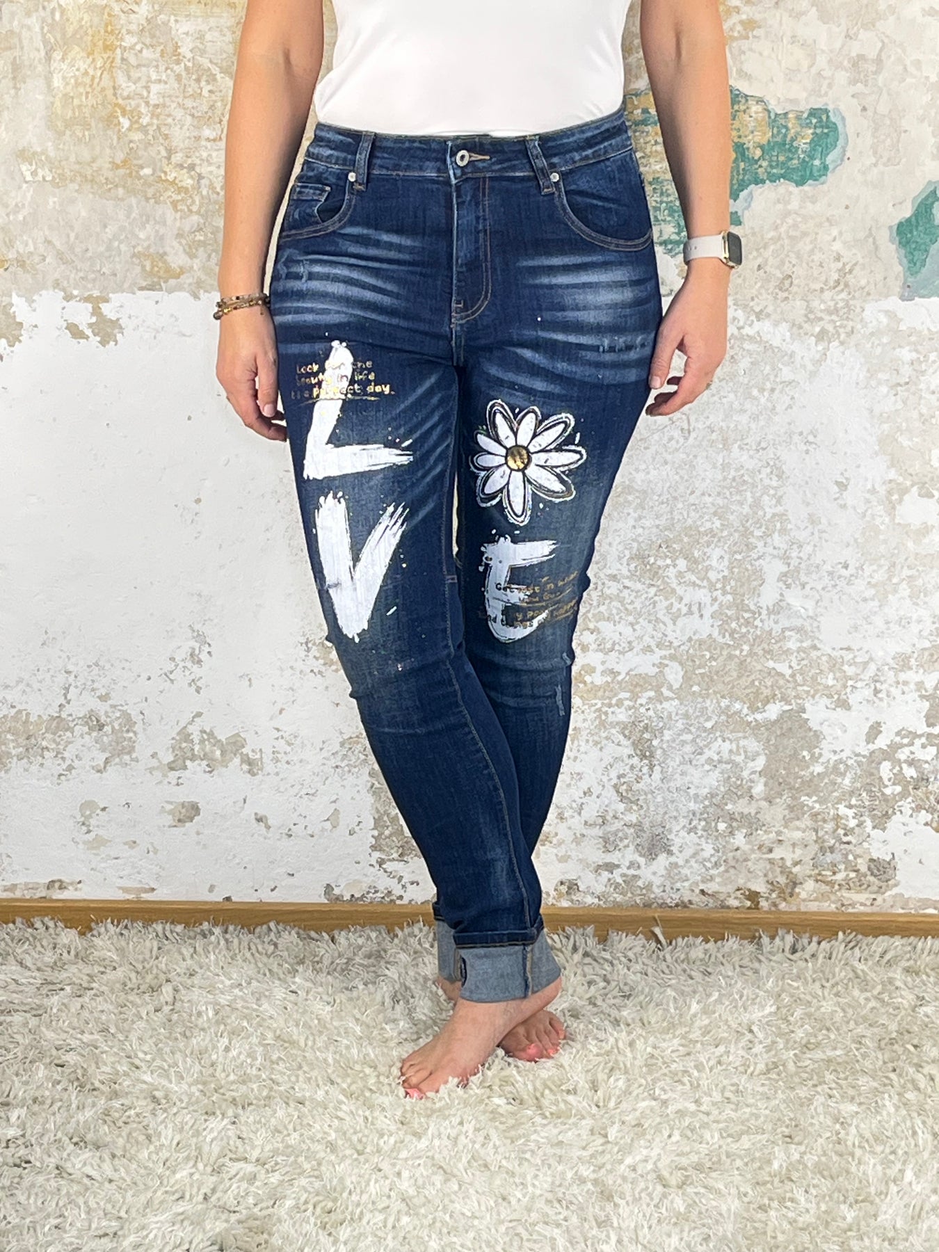 Diese Jeans in dunkler Waschung begeistert mit ihrem auffälligen „LOVE“-Print und der stylischen Blütenoptik. Der elastische Denim bietet eine tolle Passform und angenehmen Tragekomfort. Ein trendiger Hingucker, der jedem Outfit das gewisse Etwas verleiht.