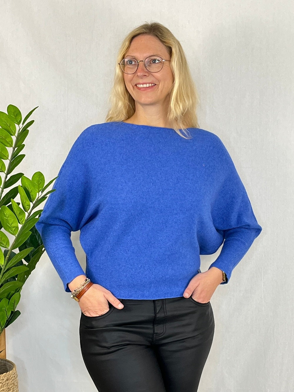 Pullover mit Fledermausarm, Rippenstrick, blau